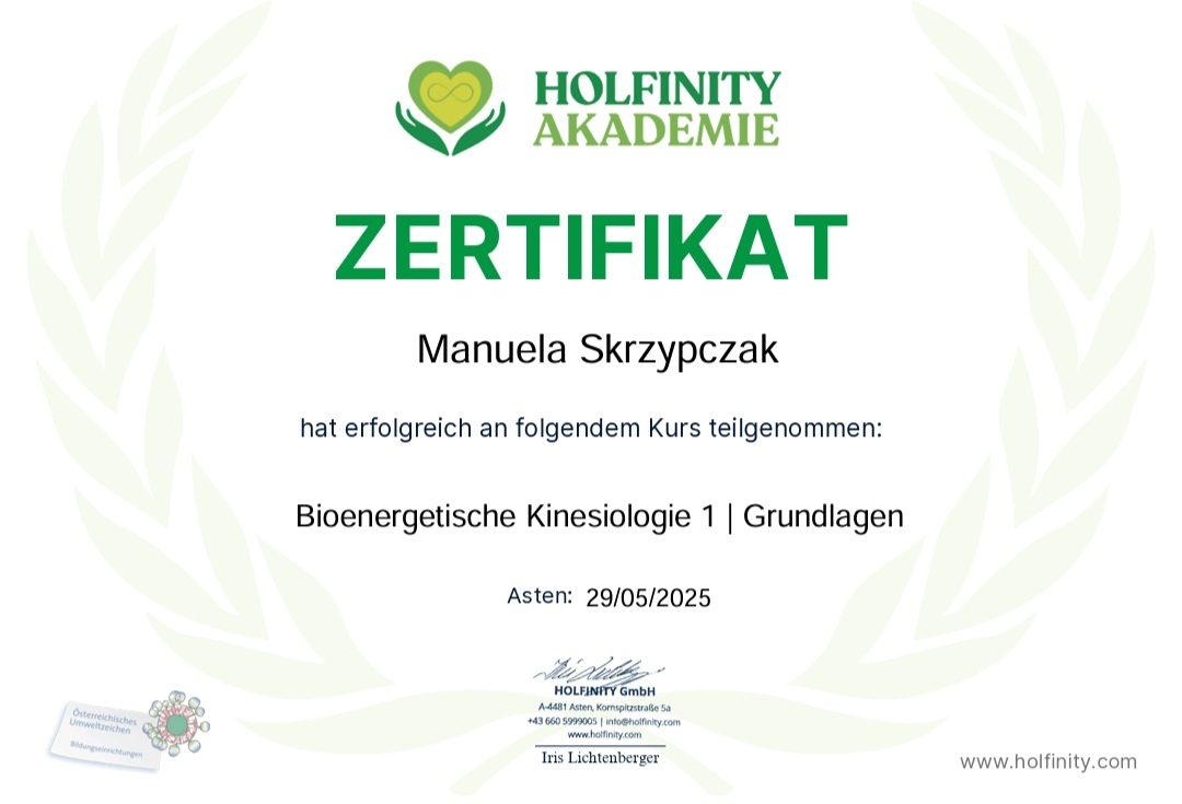 Schon seit jeher war ich fasziniert, von den Sternzeichen, Aszendenten und Horoskopen. Als Wassermann bin ich ein typischer Freigeist- geht nicht gibt es nicht! Mein erstes konkretes Erlebnis mit der Kinesiologie hatte ich in 2002. Durch Austesten und verschiedener Aufgaben hatte ich innerhalb kürzester Zeit kein allergisches Asthma mehr. Bis heute nicht. Dies hat einen AHA- Effekt hinterlassen. In 2024 kam dann in einer Gesundheitswoche die Berührung zu den 7 Chakren hinzu, sowie die Themen Innere Kind Arbeit und energetische Familienaufstellung. Eigentlich wollte ich nur etwas mehr über die Chakren erfahren und bin dann im April 2025 bei der Holfinity Akademie in Österreich gelandet. Nach einer kurzen Überlegungsphase habe ich das Fernstudium zur Bioenergetischen Kinesiologie nach Iris Lichtenberger gestartet. Jetzt, 10 Monate später, ist die theoretische und praktische Ausbildung beendet.